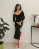 Super stretchy and shaping micro-rib jersey knit dress, with wide V-neck opening that can be worn off-the-shoulder. Waist panel for support, cut-out and high slit detail at the back. Can be worn with or without a bra.
